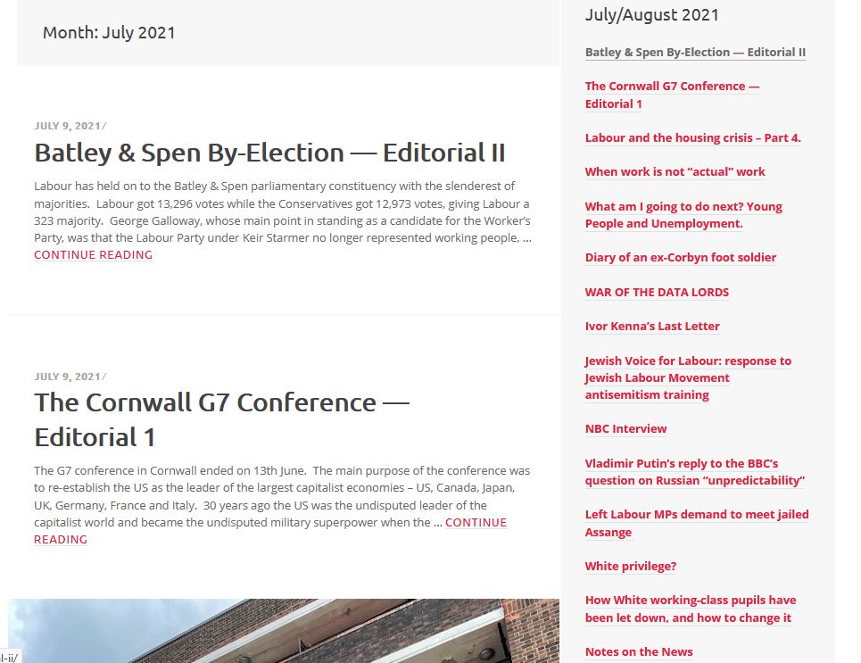 The G7 in Cornwall – Editorial; Batley and Spen by-election -Editorial; The Tory attack on council housing; Wars Of The Data Lords (Poem); When is work not ‘actual’ work?; What am I going to do next?; Diary of a Ex-Corbyn foot soldier; Notes on the News; Parliament Notes: White Privilege?; Ivor Kenna’s Last Letter; Jewish Voice for Labour: response to Jewish Labour Movement antisemitism training 5; Putin’s answer to the BBC; Putin NBC interview; Left Labour MPs demand to meet jailed Assange.